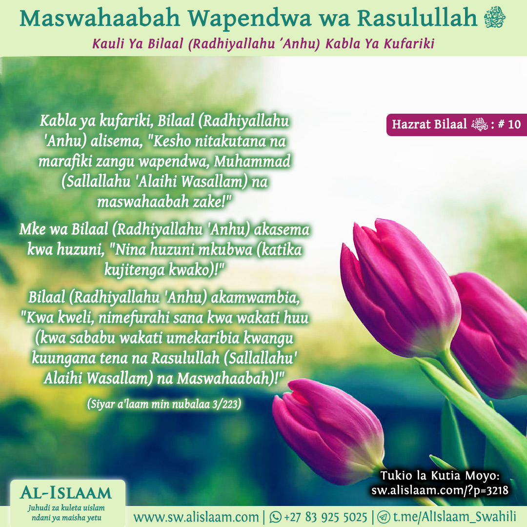 Hasan na Husain (Radhiyallahu ‘Anhuma) baadaye walikutana naye. Alipowaona, Bilaal (Radhiyallahu ‘Anhu) alimkumbatia na kumbusu kwa upendo aliokuwa nao kwa familia ya Rasulullah (Sallallahu’ Alaihi Wasallam). Baadaye walimwambia Bilaal (Radhiyallahu ‘Anhu), “Tunatamani kusikia ukitoa Adhaan kama jinsi ulikuwa ukitoa kwa Rasulullah (Sallallahu’ Alaihi Wasallam).”