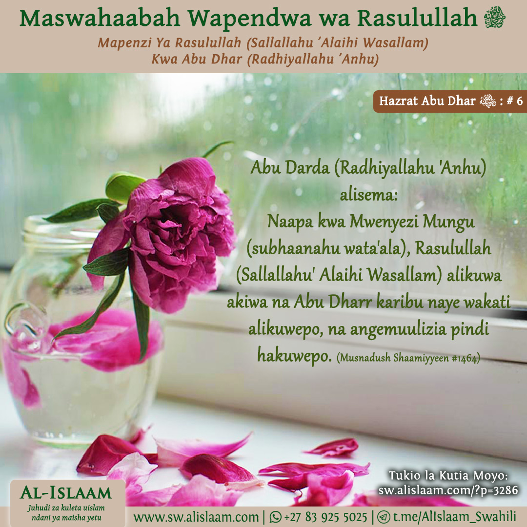 Rasulullah (Sallallahu ‘Alaihi Wasallam) kisha akasema, “Utafanya nini wakati utatolewa kutoka Shaam?” Nilijibu, “Nitarudi kwake (yaani kwa mji uliobarikiwa wa Madinah Munawwarah).”