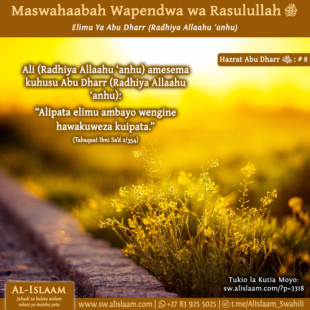 Siku moja mtu mmoja wa kabila la Banu Sulaim alimwendea Abu dharr (Radhiya Allaahu anhu) na akamwambia: “Natamani kukaa nawe ili nifaidike na elimu yako ya maamrisho ya Allah Ta’ala na sunna za mtume (Sallallahu alaihi wasallam). Pia nitamsaidia mtumishi wako katika kuchunga ngamia.”