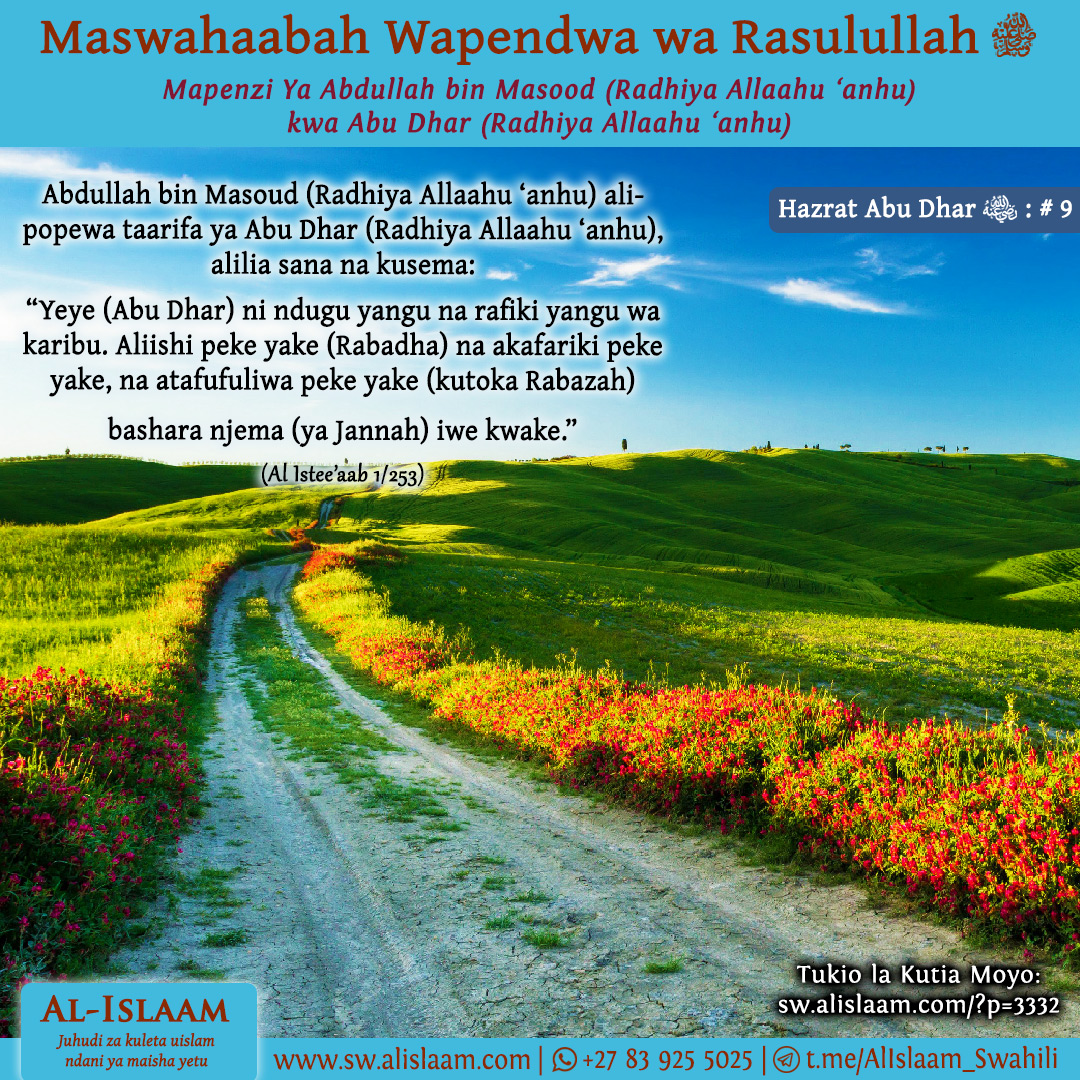 Aliposikia hayo, Abdullah bin Masoud (Radhiya Allaahu ‘anhu) alianza kulia na kusema, “Mtume (Sallallahu alaihi wasallam) alisema ukweli aliposema (katika hafla ya Tabook), “Ewe Abu dhar! Unatembea peke yako (kuungana nasi kwa msafara wa Tabuk), utapita peke yako na utafufuliwa peke yako.”