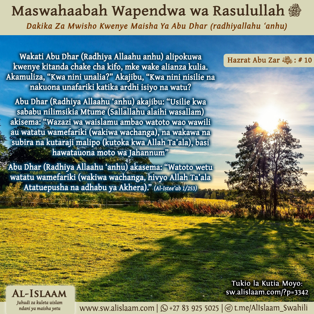 Akisema hivi, Abu dhar (Radhiya Allaahu ‘anhu) aligeuza mgongo wake na kuondoka. Yazid bin Abi Sufyaan (Radhiyallahu ‘anhu) mara moja akamrudisha yule mtumwa kwa yule mwanajeshi na akaenda nyuma ya Abu dhar (Radhiyallahu ‘anhu) akimuuliza, “Nakuomba kwa jina la Mwenyezi Mungu! Tafadhali niambie, unadhani mimi ndiye mtu ambaye Mtume (Sallallahu alaihi wasallam) amemtaja katika Hadith hii?” Abu dhar (Radhiya Allaahu ‘anhu) akajibu, “Hapana, wewe si mtu huyo.”